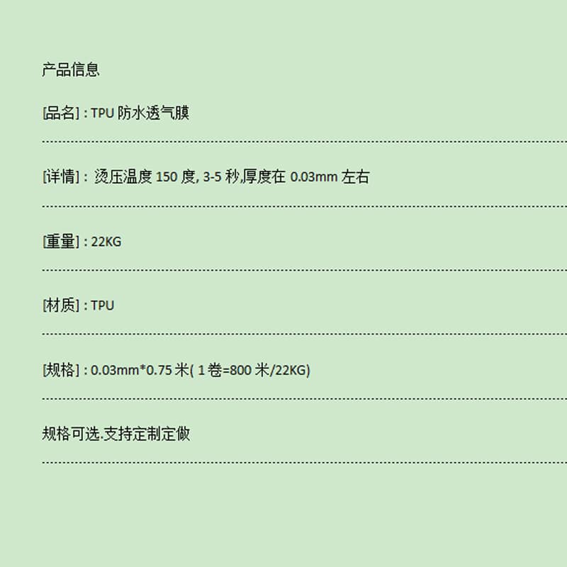 品牌贊晨產地中國廣東省廣州市品名BM是否進口否材質TPU薄膜貨號ZC-BM廠家(產地)廣州市花都區型號ZC-BM-0.03mm寬度750拉伸性能良好透氣性優產品種類TPU防水透氣膜厚度0.03mm...